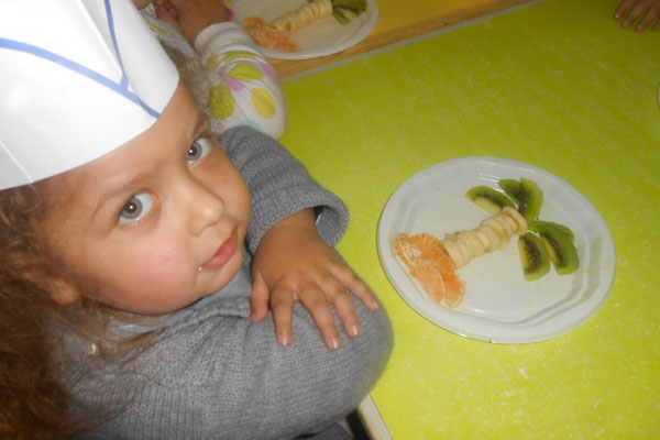 Le chef cuisinier nous a présenté toutes sortes de fruits et nous a montré la forme et la couleur de chacun... nous avons observé chaque fruit, touché, senti et goûté.
