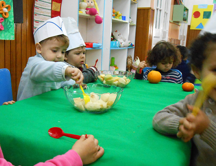 Je découvre les fruits, les couleurs, la forme, l’odeur.. dans notre atelier de cuisine nous avons délicatement coupé les fruits avec l’aide de la maîtresse, nous avons fait une salade de fruits que nous avons mangé ensemble.